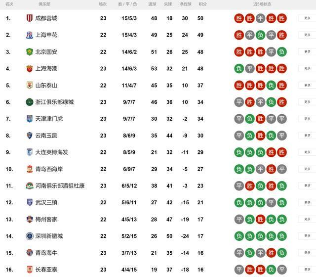 与此同时,因为其余两支争冠球队申花、国安的比赛在今晚进行,所以成都蓉城暂时登顶榜首位置。如果京沪两队本轮均未能得胜,那么争冠形势将再度发生改变。
